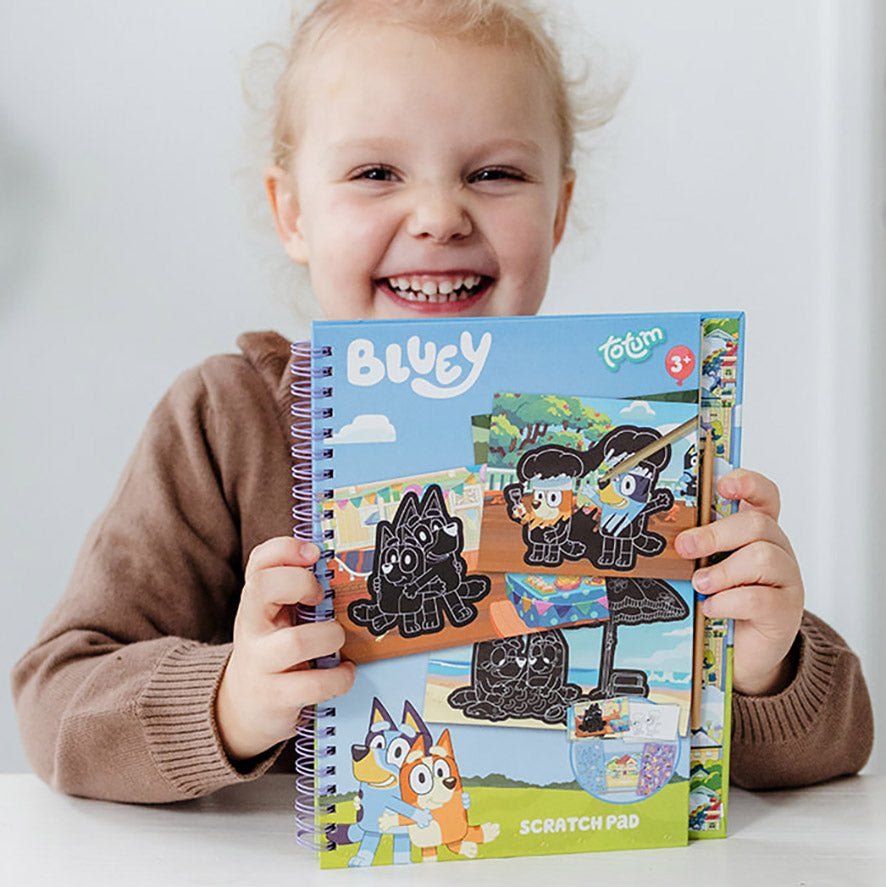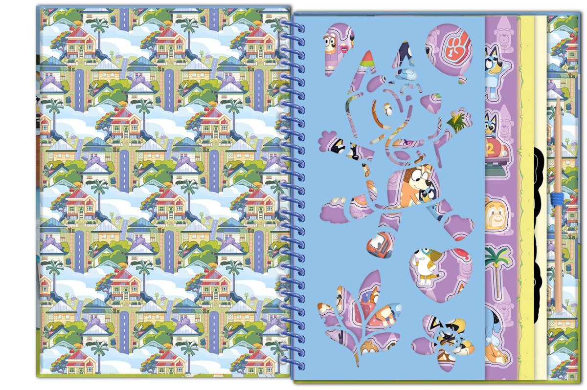 Med den här ringbundna skrapboken kan du göra de vackraste skrapkorten och färgläggningssidorna med glittereffekt. Skrapa bort det svarta lagret och fram träder metalliska Bluey-figurer, ensamma eller tillsammans med sina vänner! På baksidan av arken hittar du tio olika målarbilder, klistermärken, en återanvändbar mall och en skraplott. Jättekul att ha hemma men också på resan eller semestern!