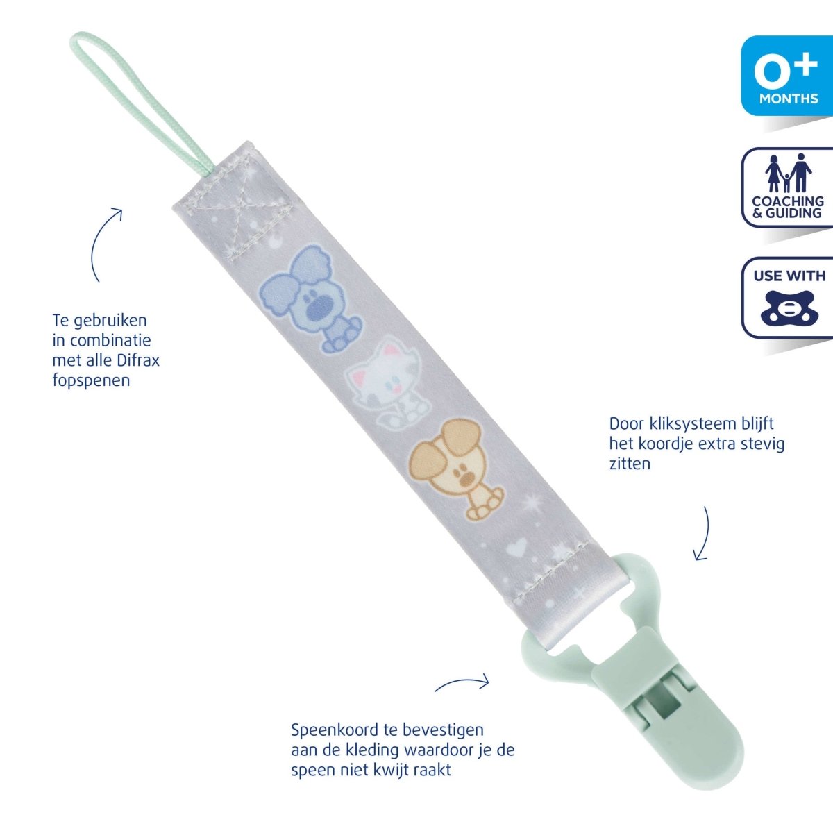 Difrax En borttappad napp orsakar ofta ångest. Du kan enkelt förhindra detta med ett nappsnöre. Difrax Nappsnöre är ett praktiskt och säkert nappsnöre som du kan fästa nappen eller tutan på. Den andra änden av nappsnöret fäster du i ditt barns kläder. Den här napphållaren ska endast fästas på kläder. Använd inte den här produkten i vaggan eller spjälsängen. Använd inte den här produkten som leksak eller bitleksak.