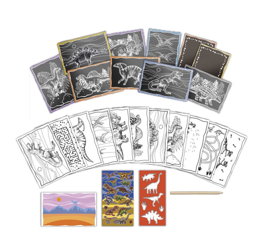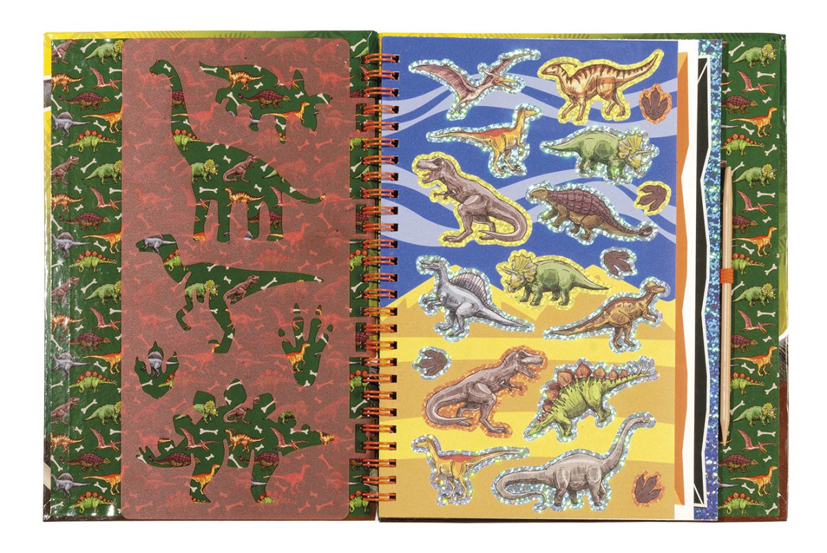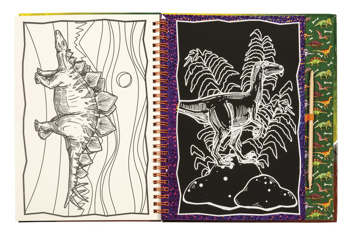 Helt magiskt! Med denna lyxiga skrapbok kan du göra de vackraste skraplotterna av dinosaurier med metallic-effekt och du kan också färglägga färgplattor Häftet har en ringpärm och är perfekt för hemma och på språng. Inga fler tråkiga väntetider under bilresor eller i en restaurang