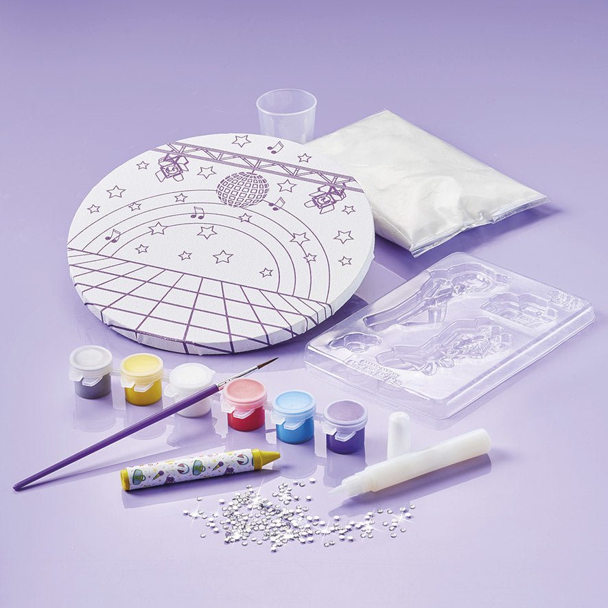 Gör din egen discomålning med det senaste DIY Factory-fodralet från Totum . Gjut 2 dansare i gips, måla dem med de medföljande 6 färgerna och gör en supersöt canvasmålning av det hela. Canvasbakgrunden är förtryckt så resultatet kommer garanterat att bli vackert! Dekorera den med strass och glitter och festen kan börja, komplett med glittrande discokula!