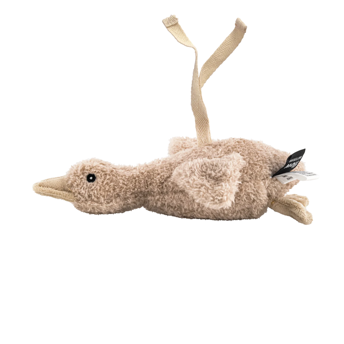 Snuttefilten on the go är en smalare version som är lätt att bära med sig. Ett gosedjur med speldosa som får ditt barn att känna sig tryggt och lugnt på språng. Du kan enkelt fästa björnhuvudet på din Maxi Cosi eller barnvagn med hjälp av snöret. Speldosan levereras med 2 ljud: Hjärtslag och vitt brus. Med en knapp kan du sätta på speldosan, justera volymen och välja ljud. Eftersom knappen är extra stor är den lätt att använda även när den sitter inuti gosedjuret.