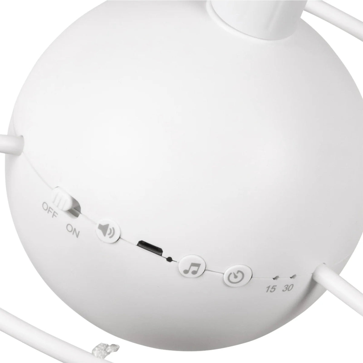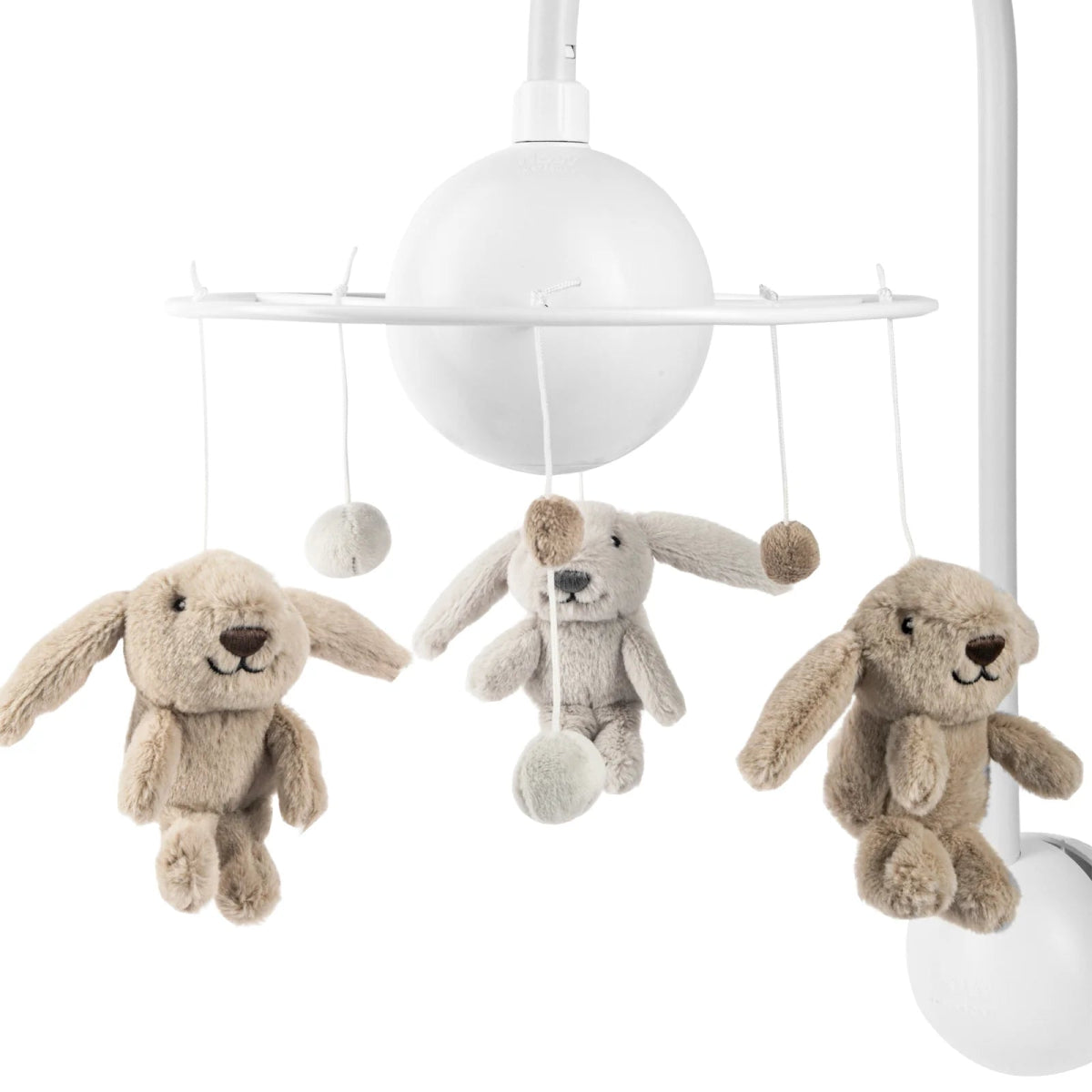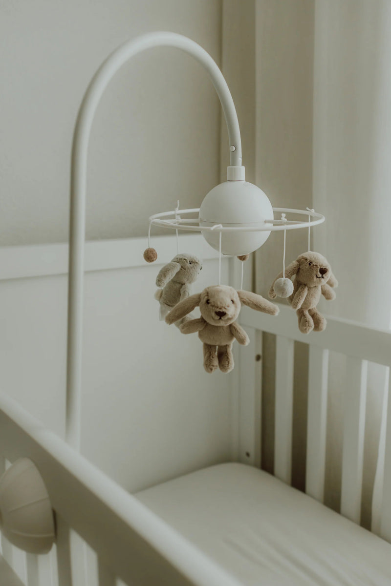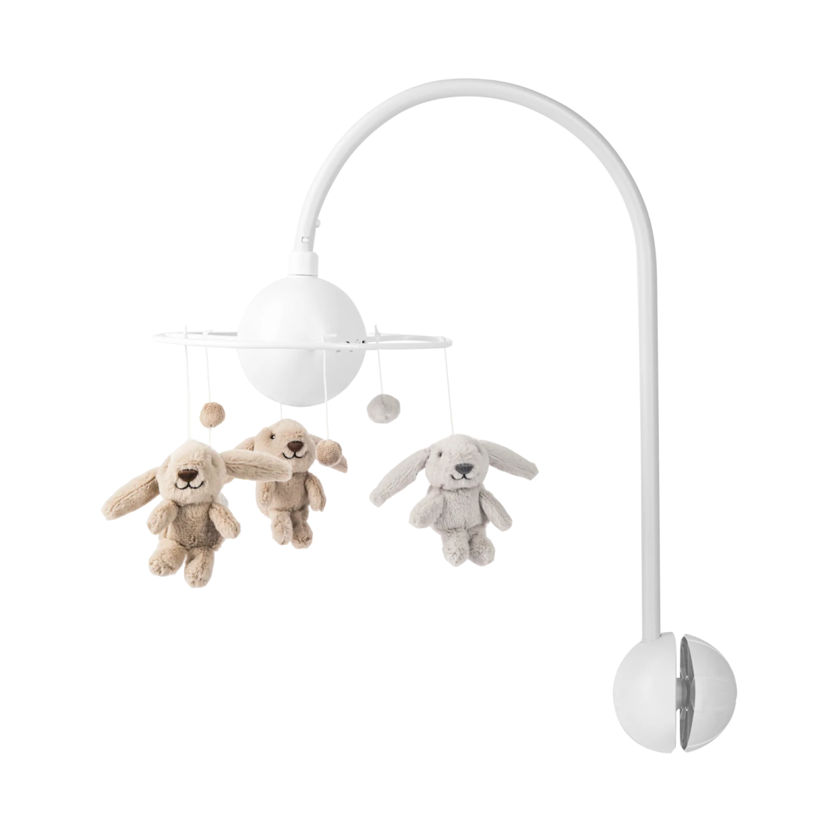 Vår Milo playpen mobile är en trendig mobil som kan lugna ditt barn genom sina söta melodier och sina söta kaninvänner. Du kan välja mellan fyra olika melodier, varav Mozart och Meditation är våra favoriter! Mobilen har en timerfunktion som tillval där du kan välja mellan 15 och 30 minuter. Den är uppladdningsbar och levereras med en fjärrkontroll. Förutom att mobilen ser snygg ut och har roliga melodier är den också bra för ditt barns visuella utveckling! Titta på produktvideon för att få en ännu bättre bild av mobilen och lyssna på alla melodier!