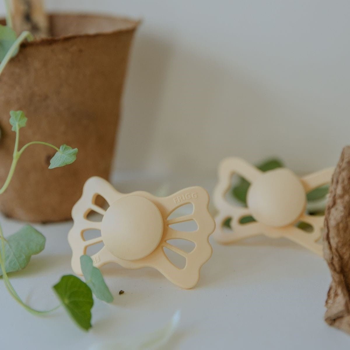 FRIGG Lucky är inspirerad av fyrklövern. Skölden har vågiga kanter som är formade som fyrklöverns blad och dessa blad speglas också på skölden och fungerar som lufthål. I mitten finns ett runt centrum som understryker nappens elegans. Fyrklövern är en universellt erkänd symbol för lycka. Den anses vara en lyckoamulett på grund av sin sällsynthet. FRIGG Lucky är gjord för att ge barn en lugnande komfort som ger lycka. Den här nappen är en lyckoamulett som kommer att förgylla varje barns liv. FRIGG Lucky är en symmetrisk napp med en något tillplattad och droppformad spene. Den symmetriska nappen ligger alltid tätt i barnets mun, oavsett om barnet är vänt uppåt eller nedåt. Nappen är utformad med en plattare hals för att minska trycket på gommen och tandköttet och även risken för sneda tänder