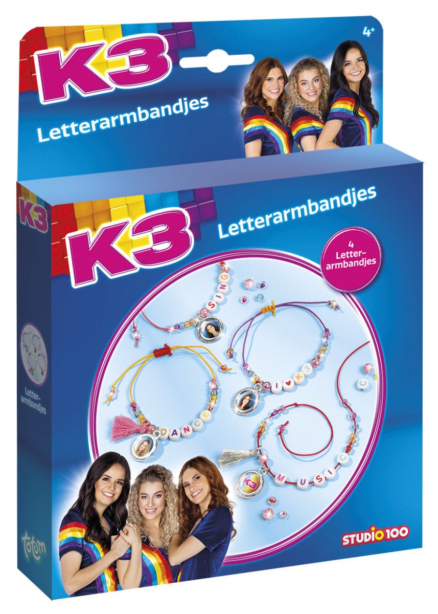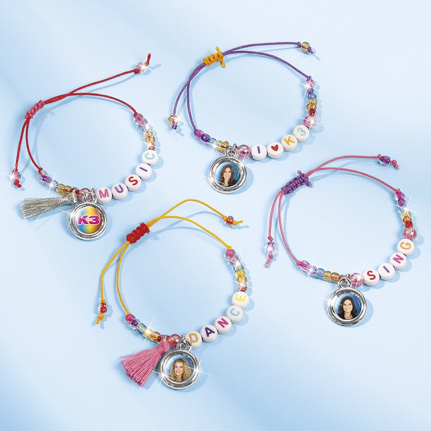Med det här roliga smyckessetet kan du göra dina egna roliga K3-bokstavsarmband med K3-berlocker från den senaste gruppen och K3-bokstavspärlor. Njut efter Studio 100-programmen och bär alltid med dig din favorit K3-stjärna.