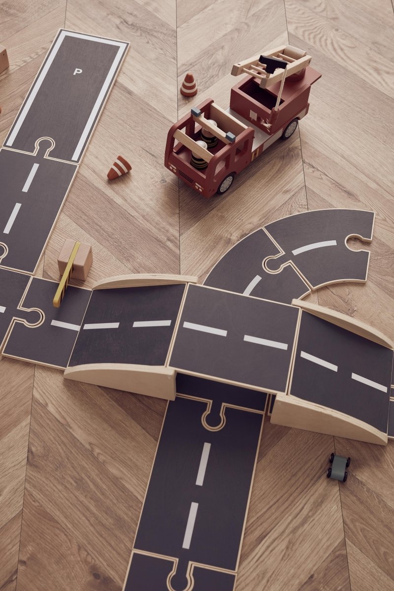 Toddlekind Snygg bilbana i trä med öppningsbar bro. Passar till våra Aiden-bilar och -bussar. Kan monteras på olika sätt. 18 delar. 74x110 cm i plywood.