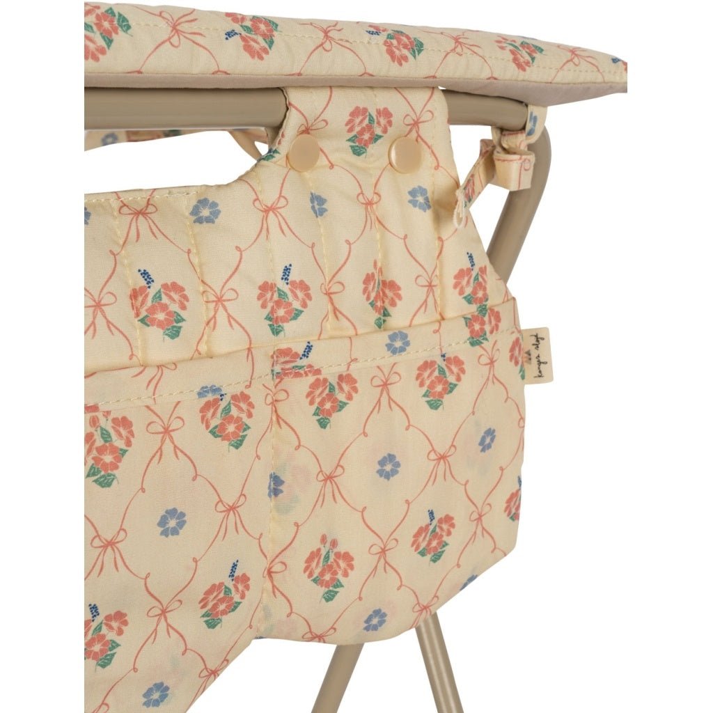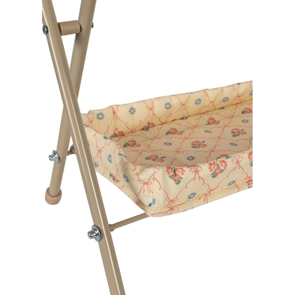 Dockskötbord med robust metallram och bord i mjuk bomull. Gott om utrymme för förvaring av docktillbehör undertill och i sidofacken. Designad med skålade kanter. Lätt att fälla ihop. H: 49 x B: 46 D: 26 cm Material: Huvudmaterial: 100% bomull Fyllning: 100% polyester Ram: 100% järn Mått Höjd: 49 cm Bredd: 26 cm Längd: 46 cm VARNING! Risk för strypning/ kvävning på grund av långa sladdar/små delar. Inte lämplig för barn under 36 månader. 3 år +