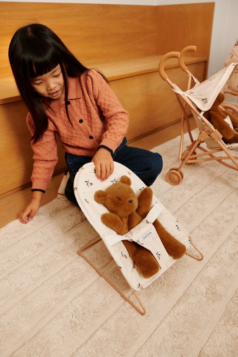 Skrämmare för dockor och nallar. Perfekt för rollspelslekar. Uppmuntrar till både social och individuell lek. Matchande vagn och barnvagn. I vårt lekfulla signaturmönster persika. Rekommenderad ålder är 3+ år.