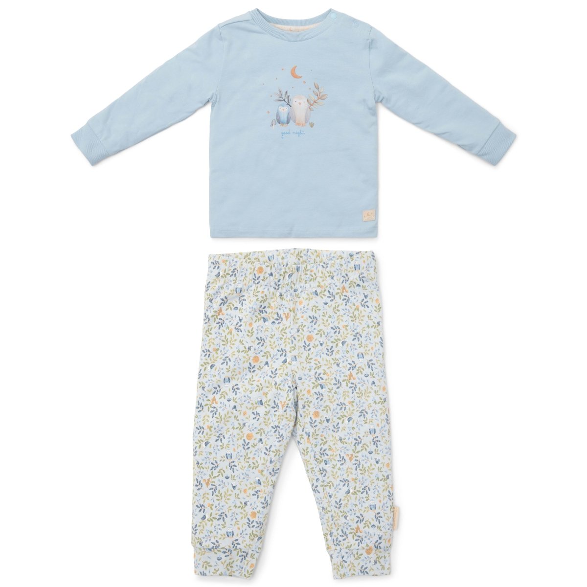 "Sov gott", säger den kloka ugglan, "det är dags att gå och lägga sig!" Njut av läggdags i denna söta pyjamas. De ljusblå byxorna har ett charmigt tryck med löv, ugglor och andra fynd från skogen, och den enfärgade ljusblå skjortan är dekorerad med en uggla och hans ekorrkompis. Pyjamasen är tillverkad av ekologisk bomull och är mjuk mot ditt barns hud och perfekt att matcha med de matchande sängkläderna. Förpackad i en fin presentförpackning och finns i storlekarna 62/68, 74/80, 86/92 och 98/104.
