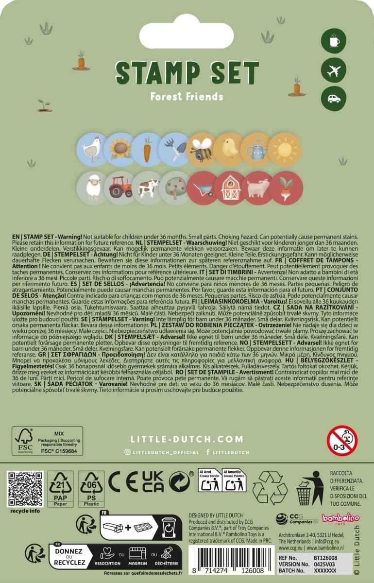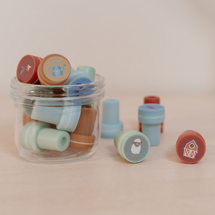 Väck liv på bondgården med de självblinkande stämplarna Little Farm från Little Dutch! Setet innehåller flera stämplar med bilder av söta bondgårdsdjur som ko, får och kyckling. Med dessa stämplar kan barnen skapa sina egna bondgårdsäventyr på papper eller färgläggningssidor. Stämplarna är självfärgande, så det behövs inget extra bläck. Ett roligt och enkelt sätt att stimulera kreativiteten och utveckla finmotoriken. I setet ingår också en praktisk förvaringslåda.