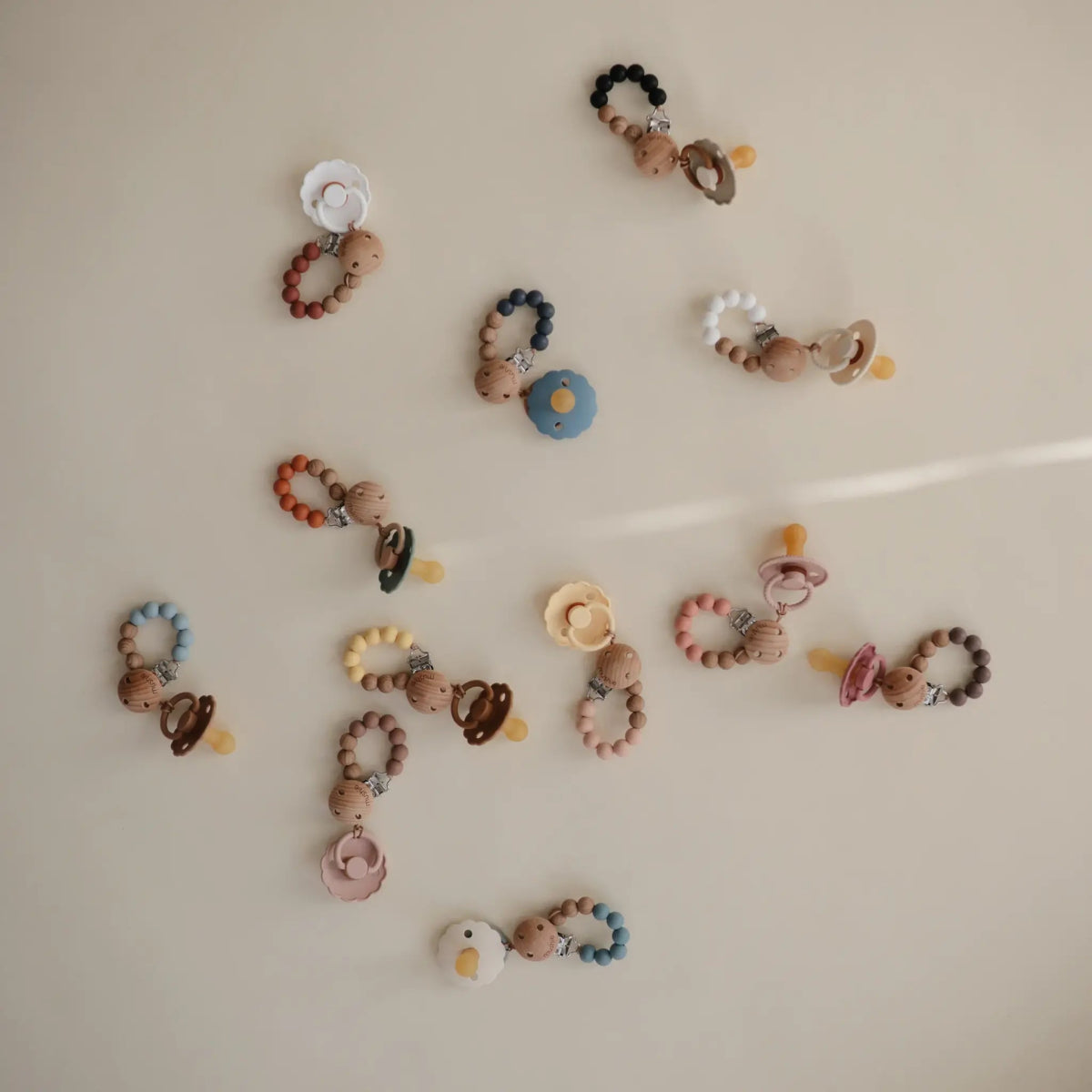 Mushie har vackra handgjorda napphållare som är certifierat säkra och testade enligt europeiska bestämmelser. De är mycket omtyckta av mammor och naturligtvis av barnen på grund av sina vackra färger och sin fina design. De vackra färgerna ger napphållaren ett lyxigt utseende.