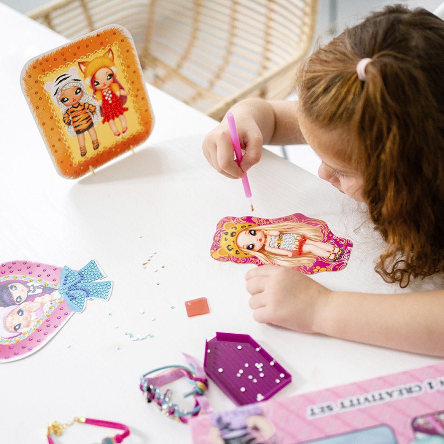 Wow överraskning! Med det här extra stora pysselsetet med Na!Na!Na! tema gör du två trendiga armband och 3 lyxiga kort med olikfärgade strassstenar baserade på den trendiga MGA-dockserien. Håll dig sysselsatt i timmar och var stolt över ditt resultat. Bär alltid med dig dina favoritfigurer och dekorera ditt rum med dessa vackra kort som kan användas som tavlor.