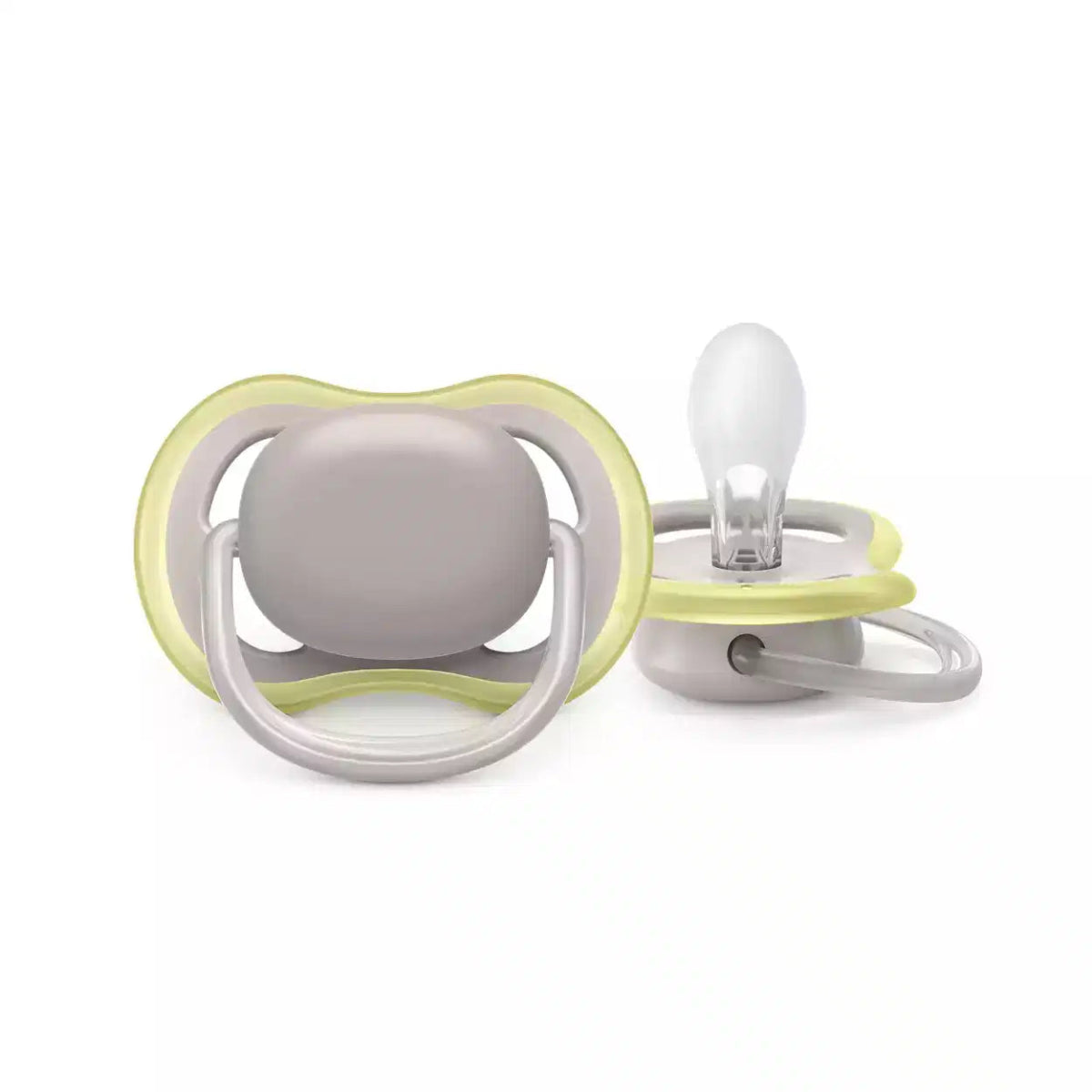 Pacifier med luftens komfort. Philips Avent Ultra Air-nappen har extra stora lufthål som håller barnets hud torr. En av de två napparna har en knapp som lyser upp i mörkret så att du kan se den när lampan är släckt.