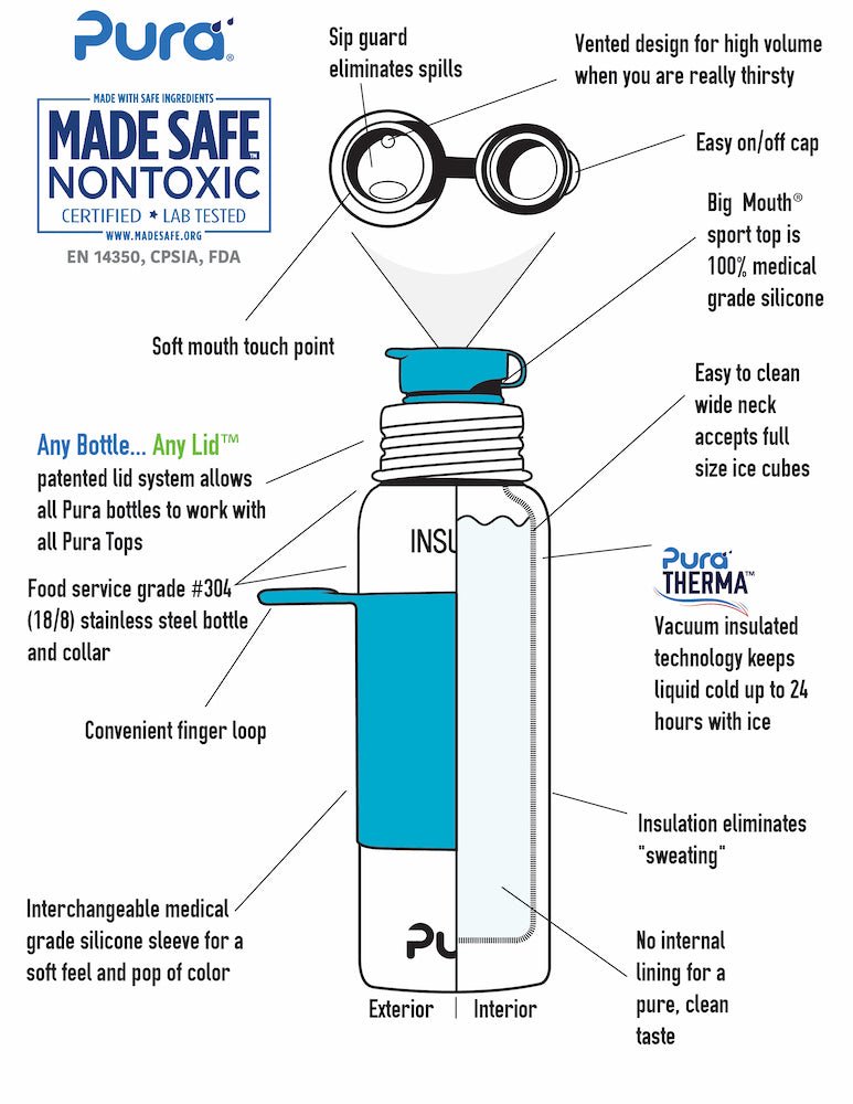 Termosen Pura i rostfritt stål är den enda 100% plastfria flaskan med pip i världen och MadeSafe®-certifierad. Den är tillverkad av högkvalitativt rostfritt stål och medicinsk silikon och är fri från BPA, BPS, PVC, ftalater och bly. Den här prisbelönta flaskan är därför helt säker för dig, din familj och miljön