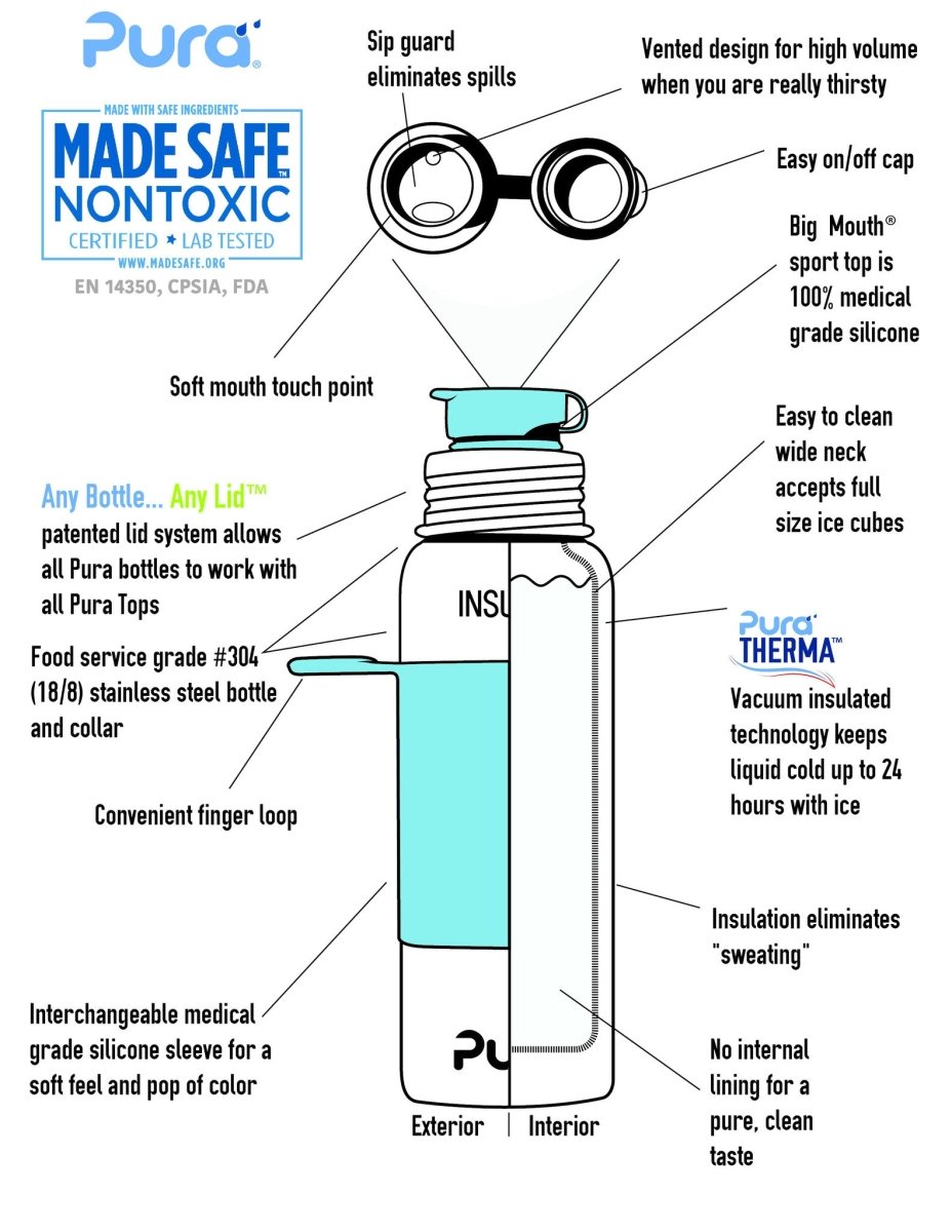 Den här prisbelönta termosflaskan i rostfritt stål är den enda 100% plastfria termosflaskan för sport! Flaskan är plastfri och därför säker, miljövänlig och framför allt praktisk. Toppen är utbytbar så att flaskan kan användas på olika sätt. För vuxna kan t.ex. sportkorken ersättas med ett sportsugrör. Men flaskan kan också användas för barn genom att toppen byts ut mot en napp, pip eller sugrör för barn. Termosen håller innehållet varmt eller kallt i upp till 6 timmar. Pura är den enda i världen som är NONToxic-certifierad av MadeSafe.org. Varför Pura: SÄKER: Den enda 100% plastfria flaskan.... så ingen säkerhetsrisk; Tillverkad av högkvalitativt rostfritt stål (#304 eller 18/9 klass); Silikon av antibakteriell medicinsk kvalitet; MadeSafe™-certifierad; Förläng livslängden på Pura -flaskor genom att byta lock. Detta gör att flaskorna håller en livstid; Fri från BPA, PVC, ftalater och bly; Flaskan levereras med sporthylsa och sportlock. Pura flaskor kan användas för att frysa vätska, använd silikonförseglingsskivan, tillgänglig separat. Överfyll inte flaskan, vätskan expanderar när den fryser (inte mer än 500 ml i 650 ml-flaskan). Obs: Använd inte sportkorken i kombination med heta vätskor, den är inte lämplig för detta ändamål! Rengöring och sterilisering Termosflaskorna Pura tål inte maskindisk på grund av isoleringsväggen. Du kan diska dem för hand med en mild tvål och en flask- och nappborste. Undvik att använda starka rengöringsmedel eftersom de kan skada flaskan. Silikondelarna på Pura -flaskorna kan dock diskas i diskmaskin.