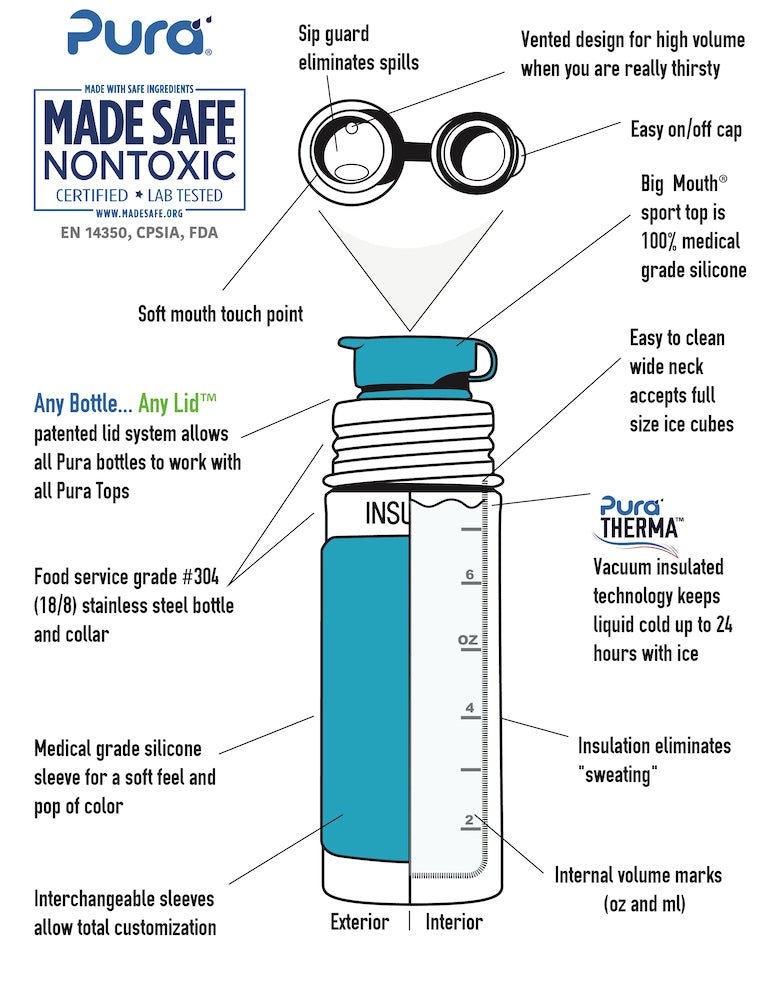 Termosen Pura i rostfritt stål är den enda 100% plastfria flaskan med pip i världen och MadeSafe®-certifierad. Den är tillverkad av högkvalitativt rostfritt stål och medicinsk silikon och är fri från BPA, BPS, PVC, ftalater och bly. Den här prisbelönta flaskan är därför helt säker för dig, din familj och miljön