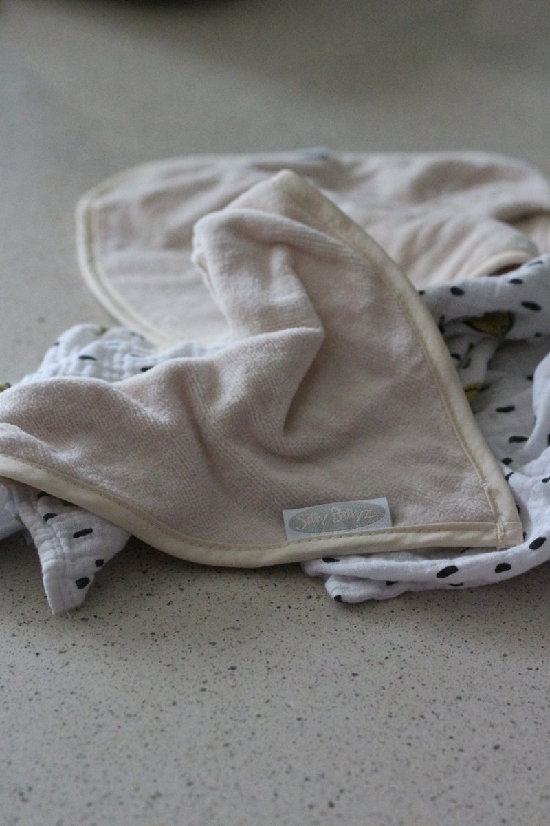 Denna Silly Billyz Bandana Bib i färgen White Sand är perfekt som en första haklapp för ditt barn. Det mjuka och absorberande tyget håller känslig hud torr, vilket är särskilt bra för barn med eksem. Den vattentäta nylonbaksidan skyddar kläderna från fukt och fläckar och håller kläderna rena. Tack vare den 3 tum stora, justerbara tryckknappsstängningen växer haklappen lätt med ditt barn. Haklappen är dessutom PVC-fri och lätt att underhålla.