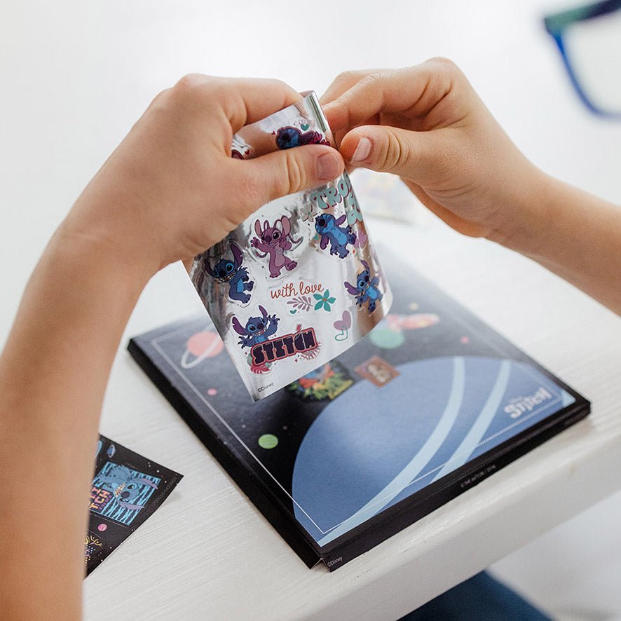 Dekorera alla dina teckningar, anteckningsböcker, kort och inbjudningar med dessa roliga klistermärken av Stitch, Lilo och Angel, eller klistra dem på den medföljande lekbakgrunden. Ge liv åt din Stitch-värld!