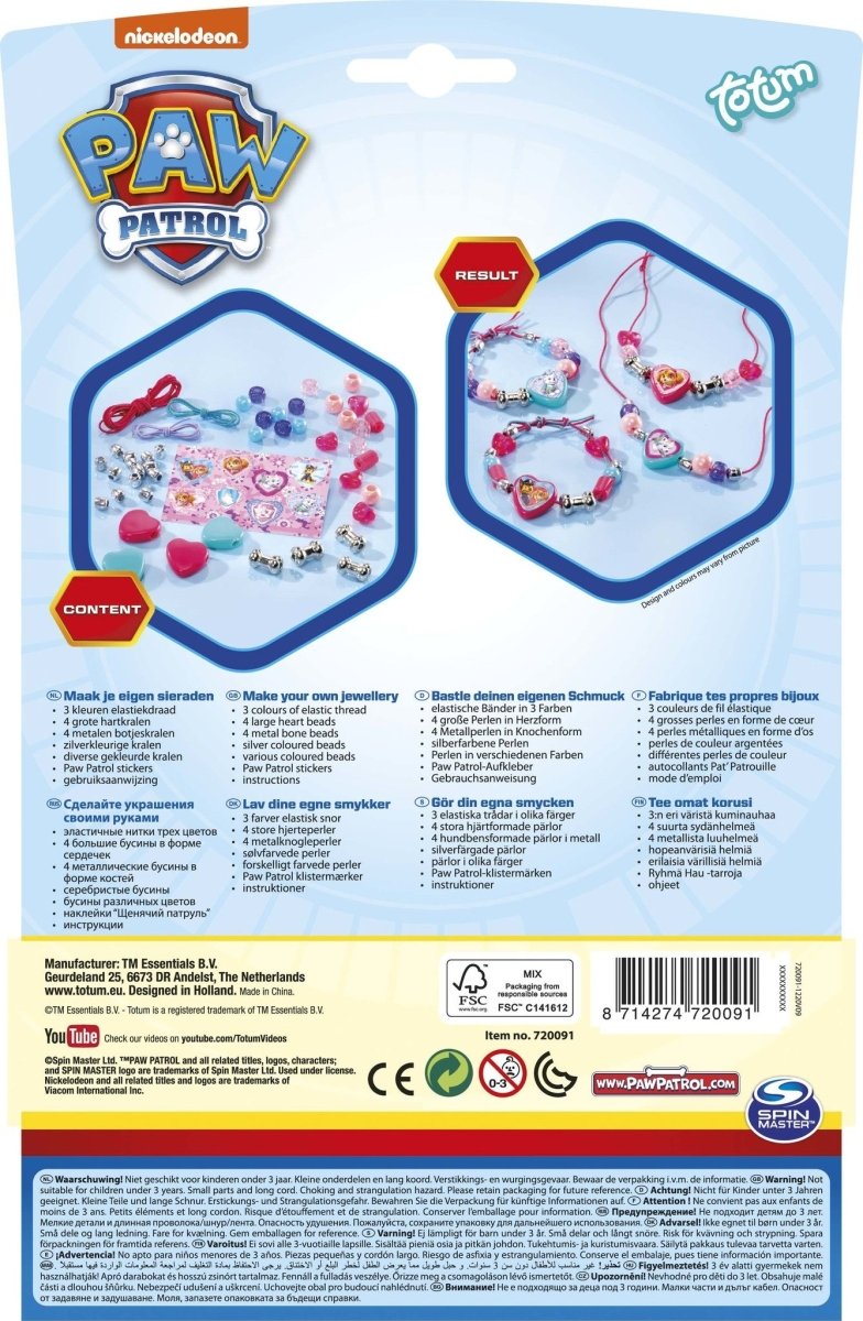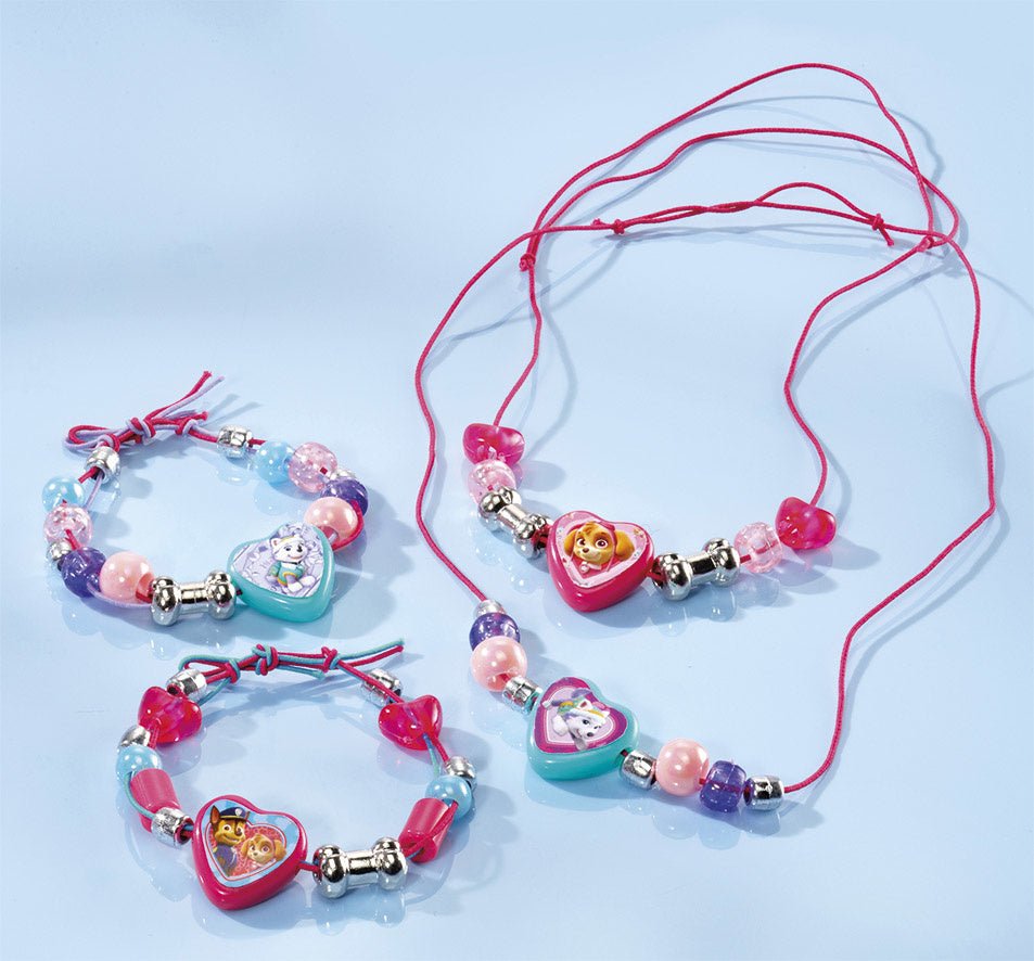 -3 färger elastisk tråd -4 stora hjärtpärlor -4 benpärlor i metall -Silverpärlor -Pärlor i olika färger -PAW Patrol klisterark -Inklusive instruktioner