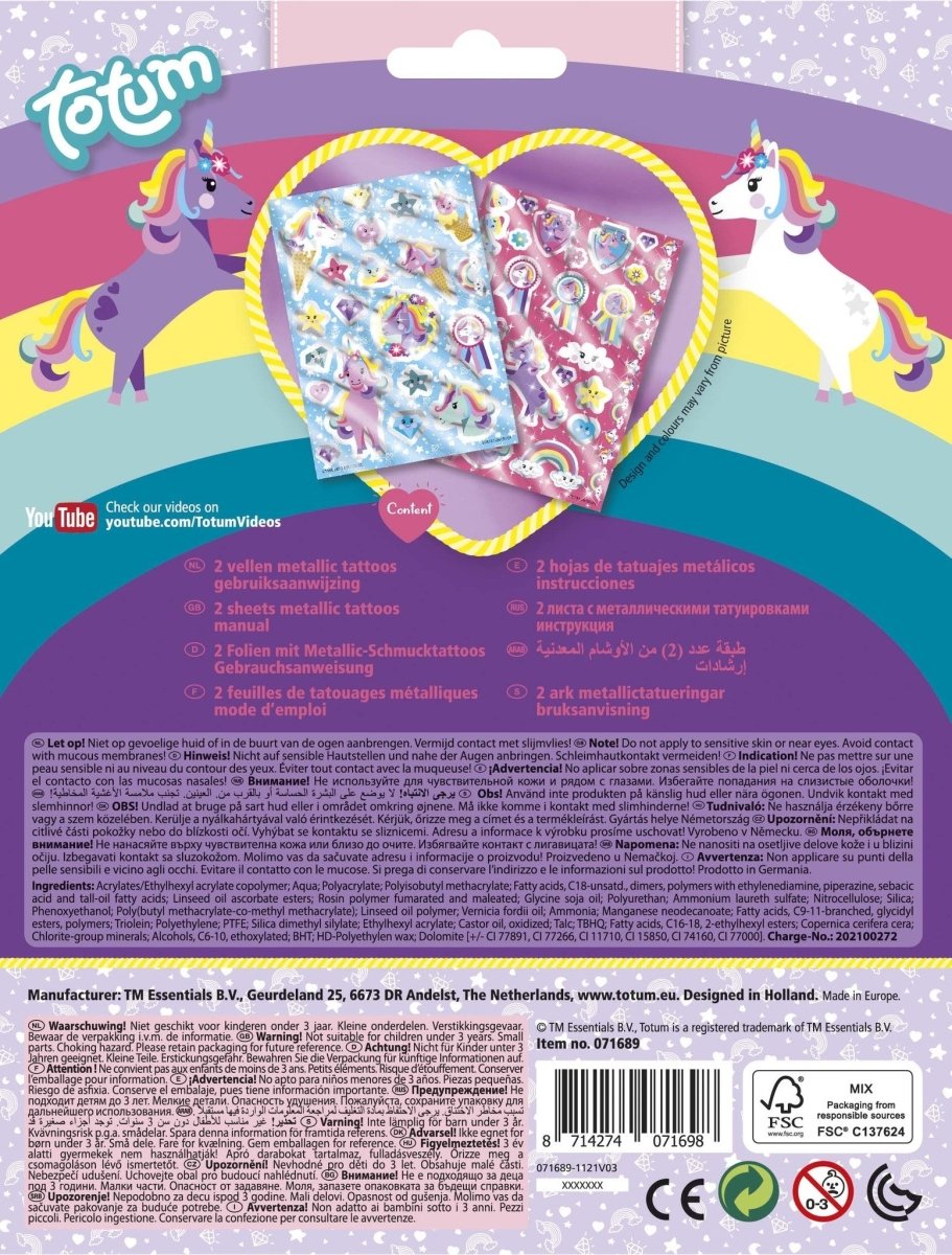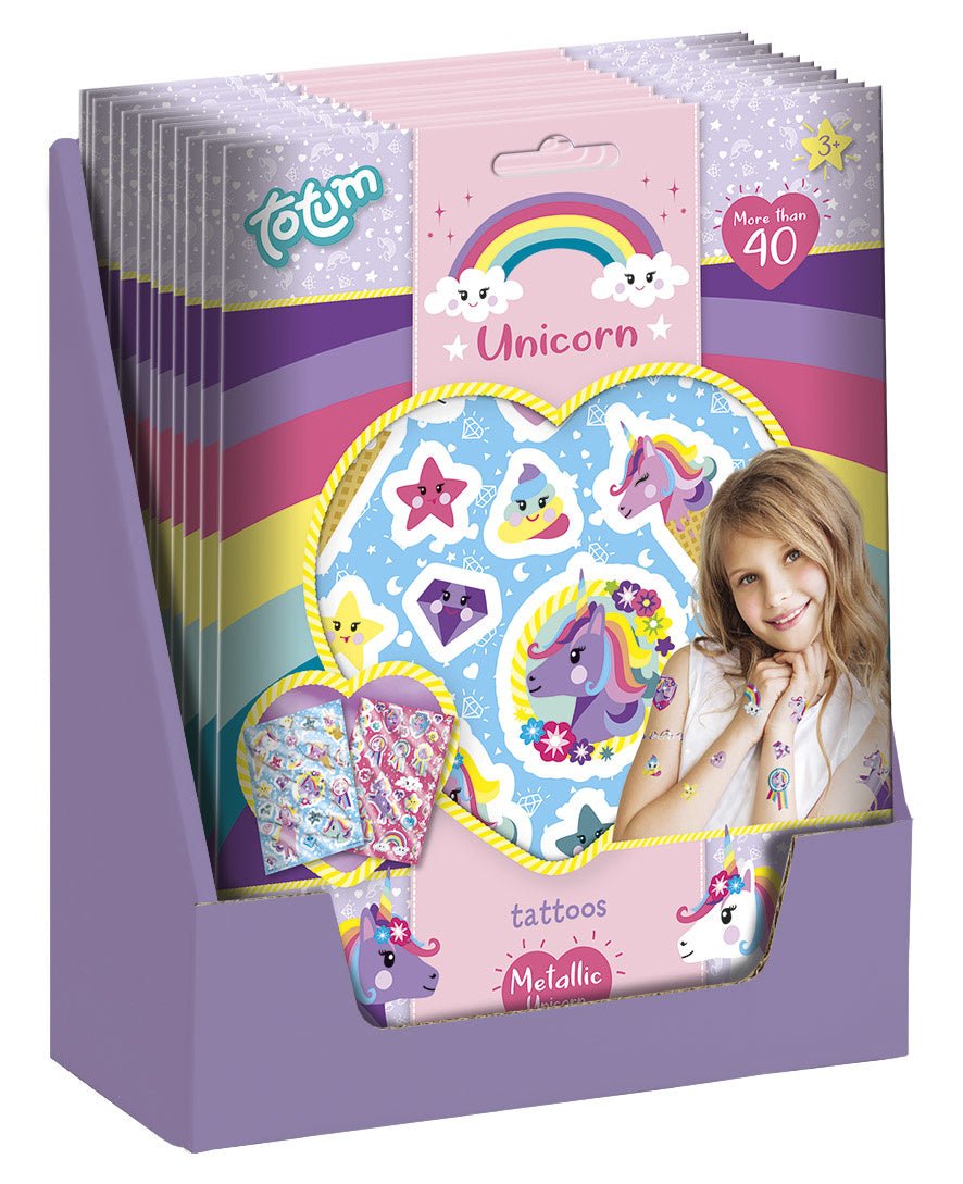 De här 40 metallic-tatueringarna i glada färger kan användas säkert på huden. Använd dem till barnkalaset, festivalen eller en rolig maskerad. - För barn från 3 år - 40 tvättbara tatueringar - Lyxig metallicdesign i många olika färger - Enhörningstema ingår - Säkert för barns hud